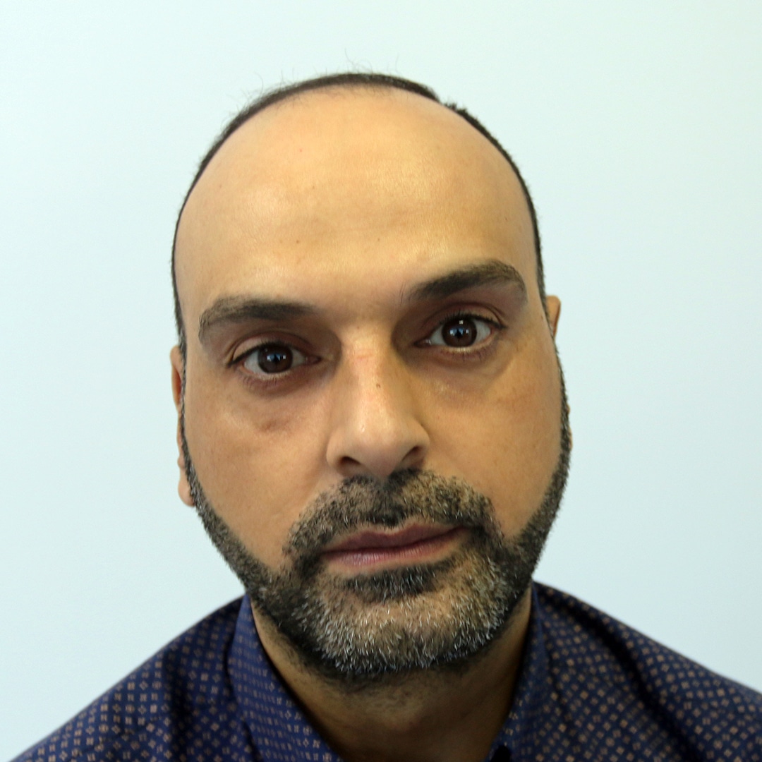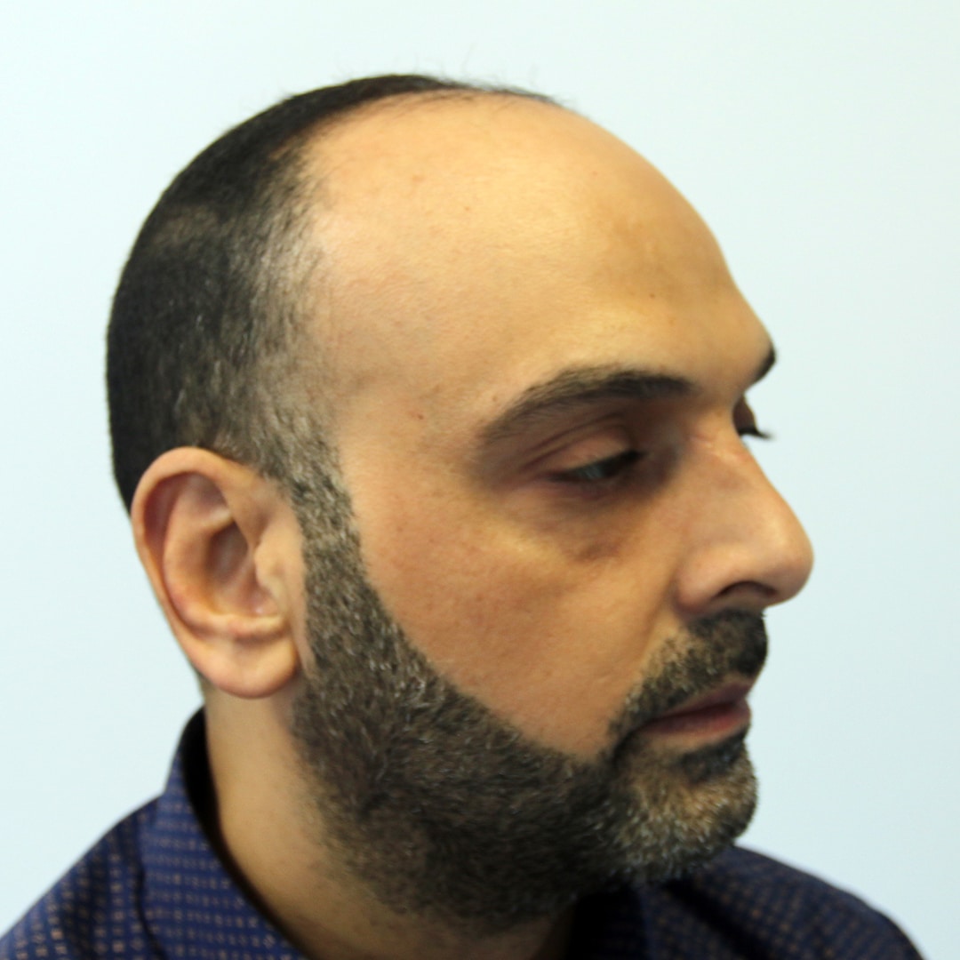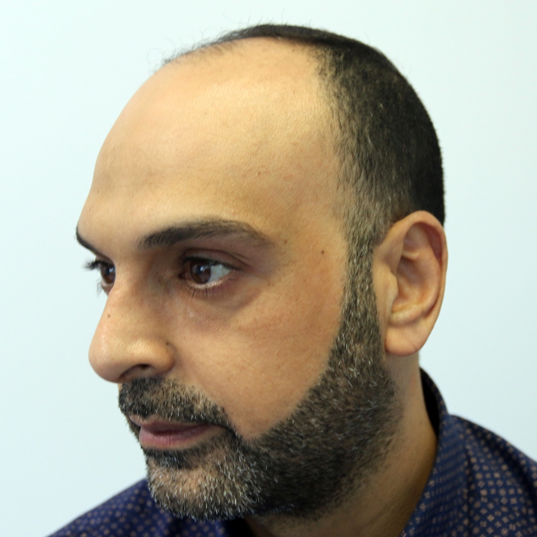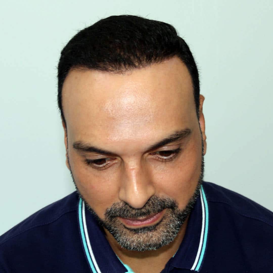 It is a very good example for hair loss in the frontal area and hair loss in both side temples and big forehead in the 40s. Look carefully at the angle of hair growth on the side temples in the photos. Side temples are a risky area in hair restoration. If the hair growth angles are not balanced well, it may cause very bad results.