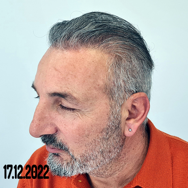 In der Zwischenzeit kann das transplantierte Haar natürlich weiß werden. Mit anderen Worten, das implantierte Haar kann wie das Haar im Spenderbereich weiß werden. Wie Sie sehen können, hat sich das transplantierte Haar des Patienten wie das Haar im Spenderbereich weiß verfärbt.