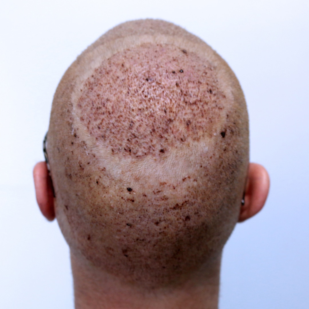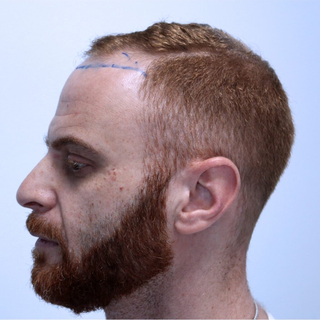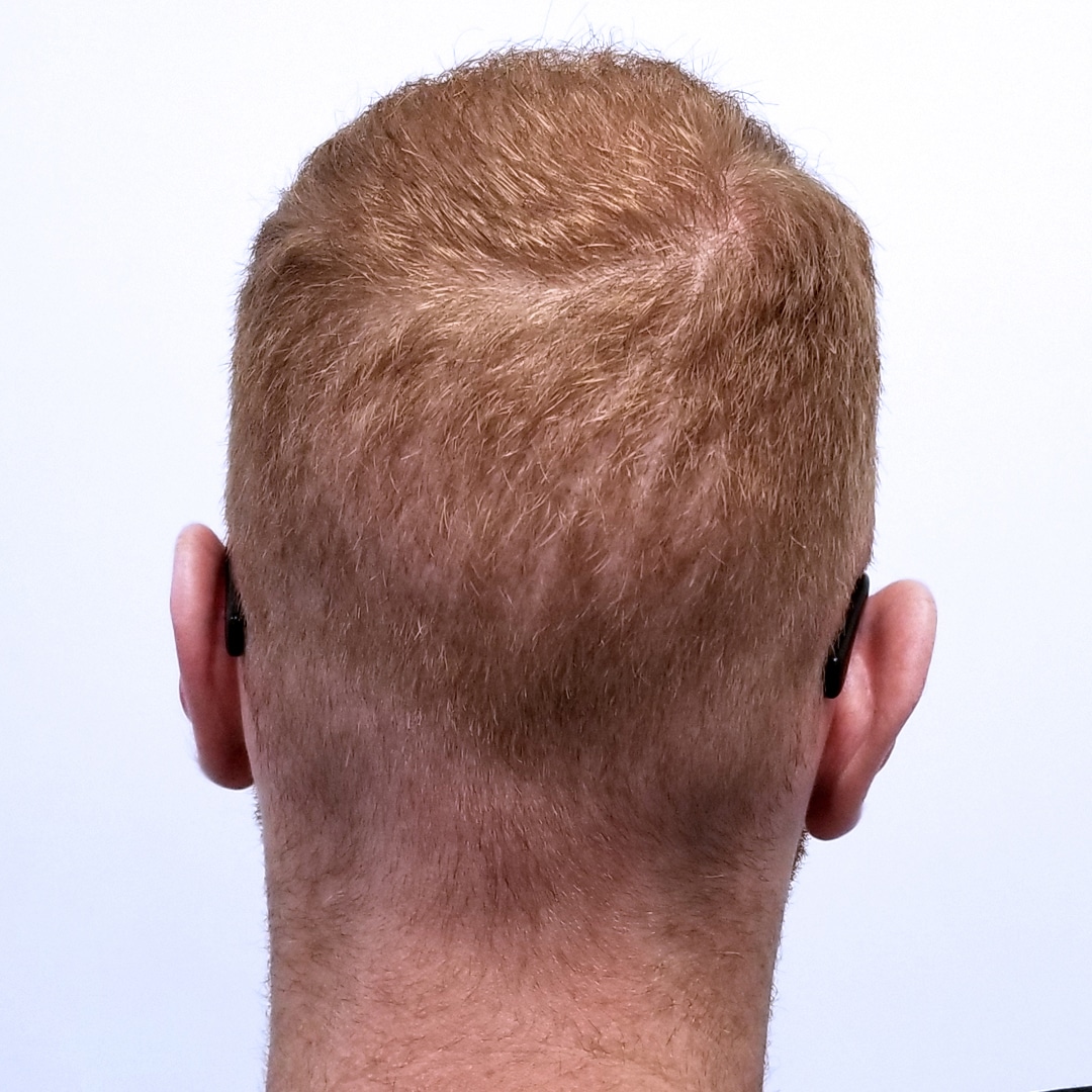 Our patient, who is in his late 30s and has Norwood 4 scale hair loss, is ideal for transplantation results on dark blonde hair. In this case, approximately 2500 hair grafts were transplanted for the frontal region and approximately 1500 grafts for the crown. It has appropriate photos to evaluate the results of crown area hair transplantation with 1500 grafts.