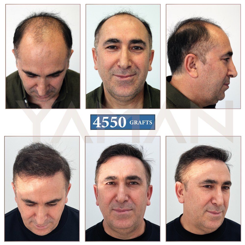 La caída del cabello puede afectar significativamente la autoestima, especialmente en la mediana edad. Uno de nuestros pacientes de mediana edad se sometió a un trasplante capilar de 4550 injertos antes y después en nuestra clínica para lograr una apariencia más llena y juvenil.