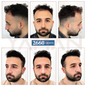 As can be seen from the 2660 hair grafts before and after photos, this young patient underwent a hair replacement surgery of the front and crown areas. The surgery provided him with an excellent hairline and satisfying volume in the frontal region.