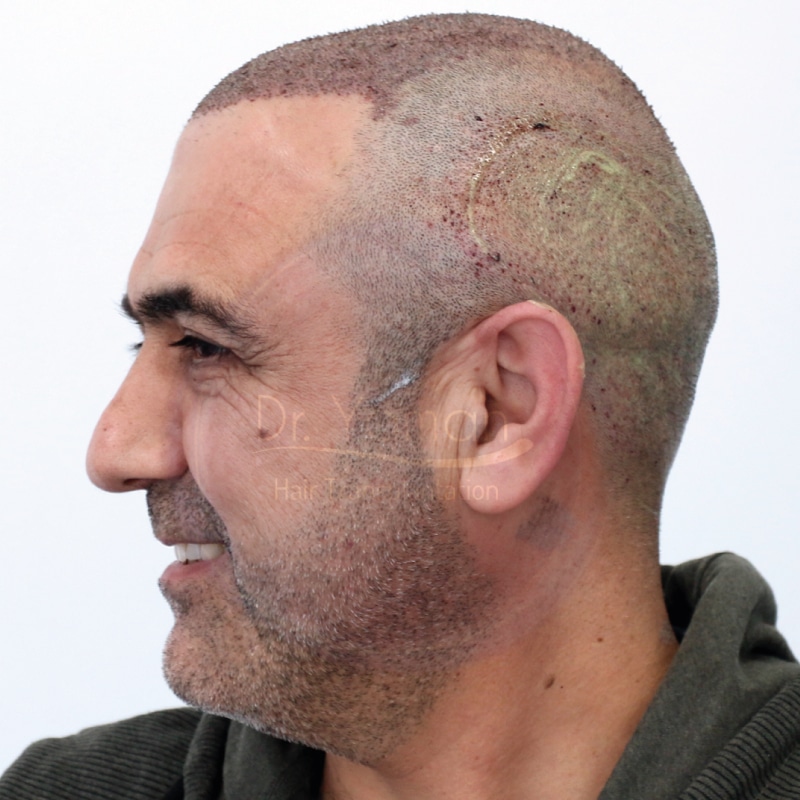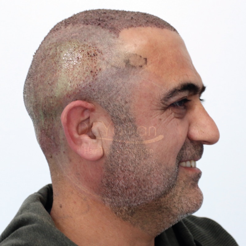 Di solito, il trapianto di capelli per un paziente di Norwood 5 può essere effettuato in due sessioni. Ma il Dr. Yaman è riuscito con successo ad estrarre e impiantare 4600 innesti in una sola sessione. Il nostro medico ha utilizzato 820 innesti singoli, 2340 innesti doppi e 1520 innesti multipli in questo restauro dei capelli. Il nostro paziente è rimasto soddisfatto del risultato di questa operazione e non ha ricevuto alcun trattamento di supporto.